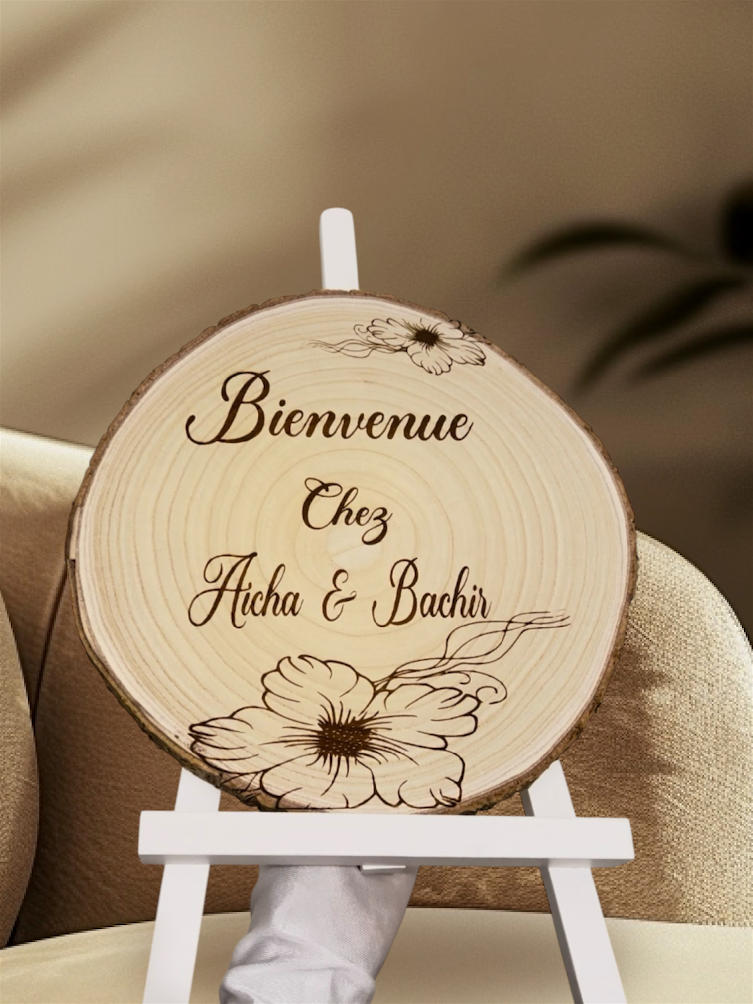 Un rondin de bois naturel gravé avec la mention “Bienvenue chez…” à personnaliser avec le nom ou prénom de votre choix.